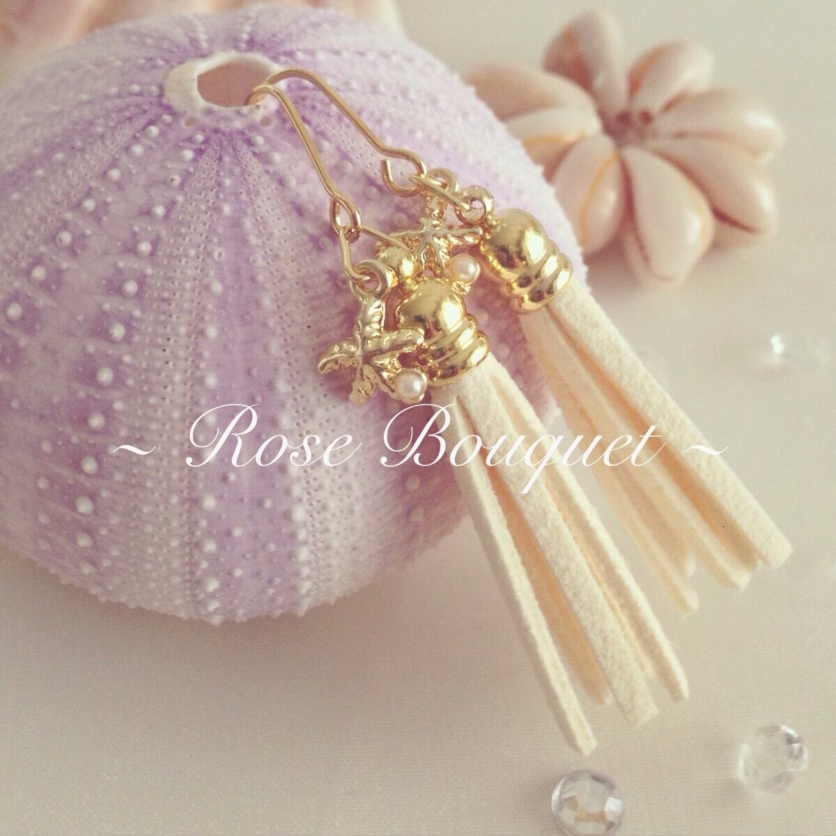 涼しげなホワイトカラーのタッセルと可愛らしいパール付きスターフィッシュのピアス/イヤリングです。ゴールドとホワイトの組み合わせはエレガントで爽やかな印象に。